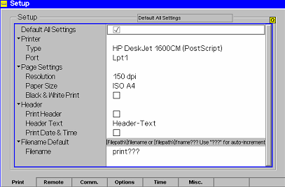 Ø To open the Setup – Print tab press the SETUP key at the front of the instrument and activate the Print hotkey at the lower edge of the screen. Ø In the Printer section set the printer type and port (COM 1 or COM 2 for the serial (RS-232) ports; LPT 1 for the parallel printer port). It is recommended to connect the output device to the parallel interface LPT, if possible: With this selection, configuration of the interface is not necessary; besides, the serial connectors may be used for GPIB bus etc.
