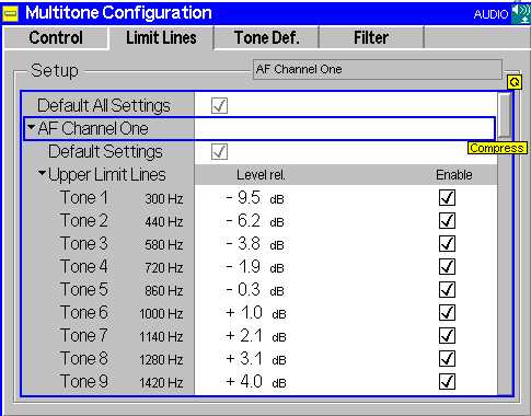 | Default Settings | The Default All Settings switch assigns default values to all fields in the Limit Lines tab (the default values are quoted in the command description in chapter 6 of this manual). Two additional default switches reset all AF Channel 1 or all AF Channel 2 settings, respectively. |